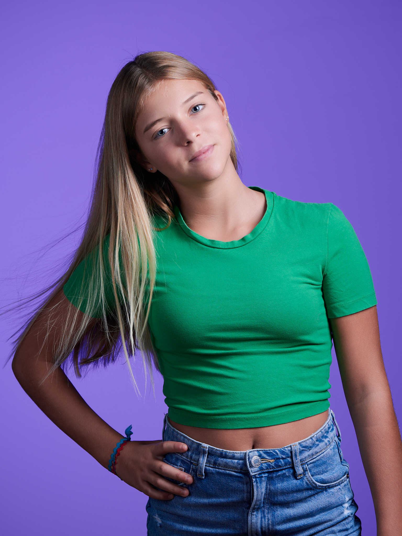 - Univers colorés et moderne : Pour des portraits plus vifs, j’utilise des éclairages créatifs et des fonds colorés pour aboutir à des créations artistiques, élégantes et authentiques.